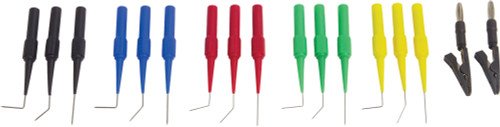 - Alligator clips allow many ways to connection to multimeter probes. The probes are fully insulated which provides added protection. The alligator provides a better way to connect, reducing the chance of a bad reading. 17 piece set will include probes that will work with .027 wire, (3)- red straight, 45 degree, and 90 degree, (3)- green straight, 45 degree, and 90 degree, (3)- yellow straight, 45 degree and (2)-black alligator clips. It will also include two set of probes that will work with .040 wire, (1)- blue straight, 45 degree, and 90 degree and , (1)- black straight, 45 degree, and 90 degree.