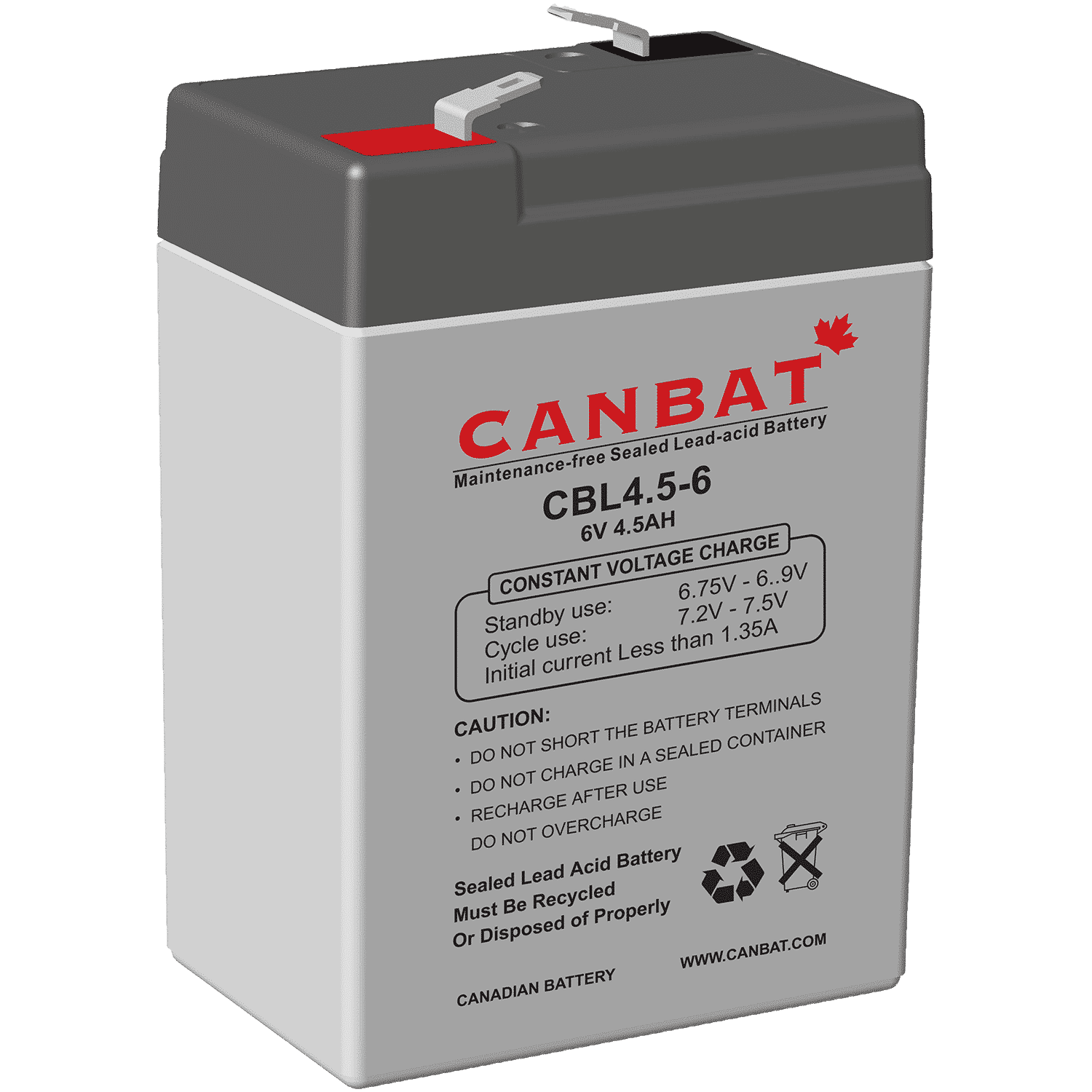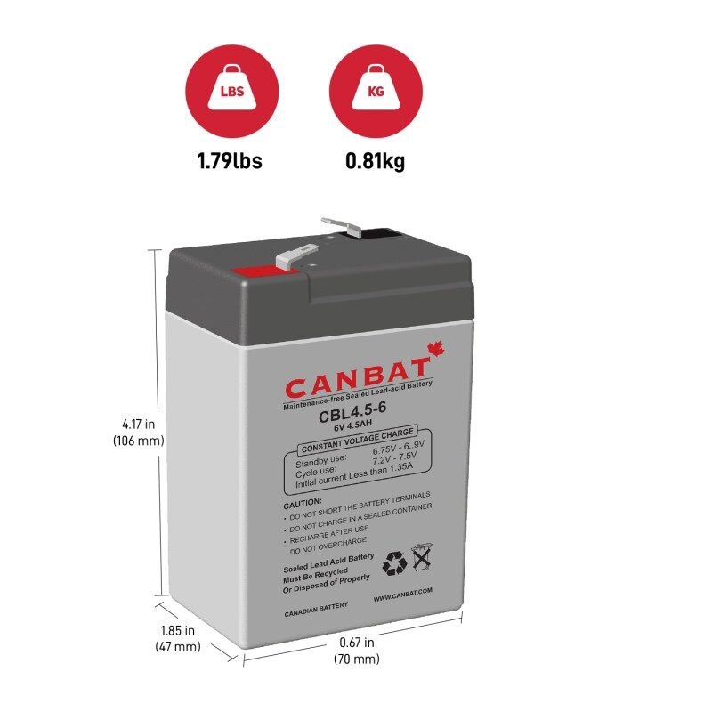 The Canbat CBL4.5-6 battery is a 6V 4.5Ah rechargeable sealed lead-acid (SLA) battery with T1 Terminals. This 6V SLA battery is designed for light cyclical and standby applications such as alarms, UPS systems, electric wheelchairs, trailer breakaway systems, exit signs, emergency lighting systems, booster packs, electric gates, toy ride-on vehicles, medical equipment, telecommunications systems, and much more. Canbat 6V 4.5Ah SLA battery is engineered with Absorbent Glass Mat (AGM) technology offering superior performance and high reliability. AGM batteries are valve-regulated and spill-proof, allowing safe operation in any position. This 6V 4.5Ah SLA battery also offers unbeatable power to volume ratio yielding greater energy density. Canbat is a 6 volt 4.5 amp SLA battery Canada supplier offering AGM batteries across Canada with free shipping!
