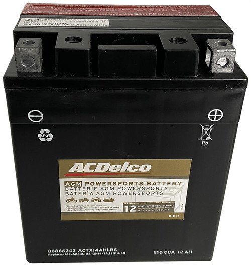 ACDelco Gold 12 Month Limited Warranty Powersports Vehicle Batteries are a high-quality alternative to Original Equipment (OE) parts. These batteries feature advanced AGM (Absorbed Glass Mat) technology that helps improve life and performance, through-the-partition construction to shorten the electrical current path and reduce resistance resulting in boosted cranking power. Specialized Lead/Calcium alloy helps to reduce self-discharge and optimizes starting power. Our AGM batteries are manufactured under strict quality control to help assure performance and long life. The AGM design allows easy installation without the worry of acid spills and the need to check water. ACDelco Gold parts are manufactured to meet your expectations for fit, form, and function, making them a smart choice for most makes and models of Power Sport vehicles as well as special applications. These high-quality parts are backed by General Motors. Battery posts, terminals and related accessories contain lead and lead compounds, chemicals known to cause cancer, birth defects and other reproductive harm. Wash hands after handling.