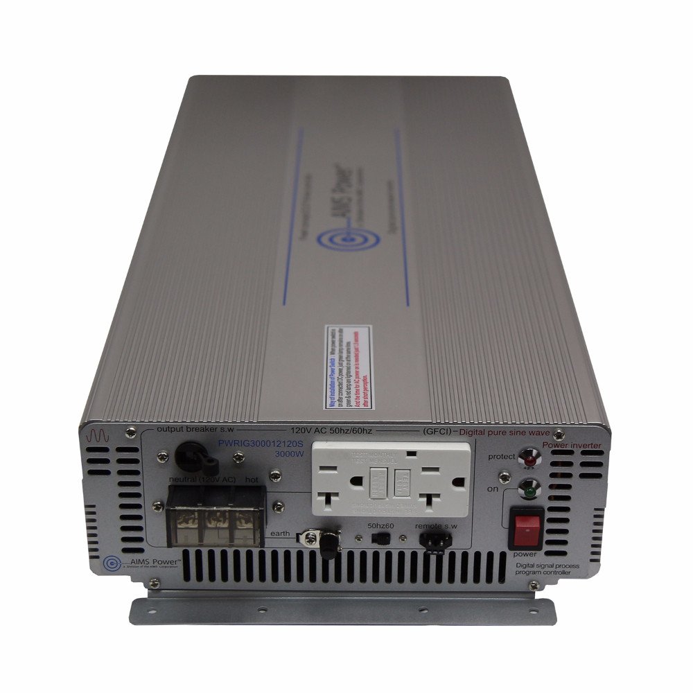 AIMS Power PWRIG300012120S 3000 Watt Pure Sine Power Inverter delivers clean, stable power, making it ideal for sensitive electronics, vehicles, off-grid setups, and backup power during outages. Designed to maintain consistent performance even as battery voltage fluctuates, it ensures reliability for computers, printers, and cordless tool chargers. The inverter features a direct connect AC terminal block for full power utilization and a GFCI dual outlet for easy appliance connections under 1500 watts. Its thermally controlled fans enhance efficiency while reducing noise, making it a dependable power solution.
