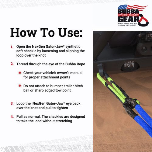 - NexGen PRO Gator-Jaw Synthetic Shackle is 5/16″ thick by 5.5Ó bow width & 26,000 lbs. load capacity