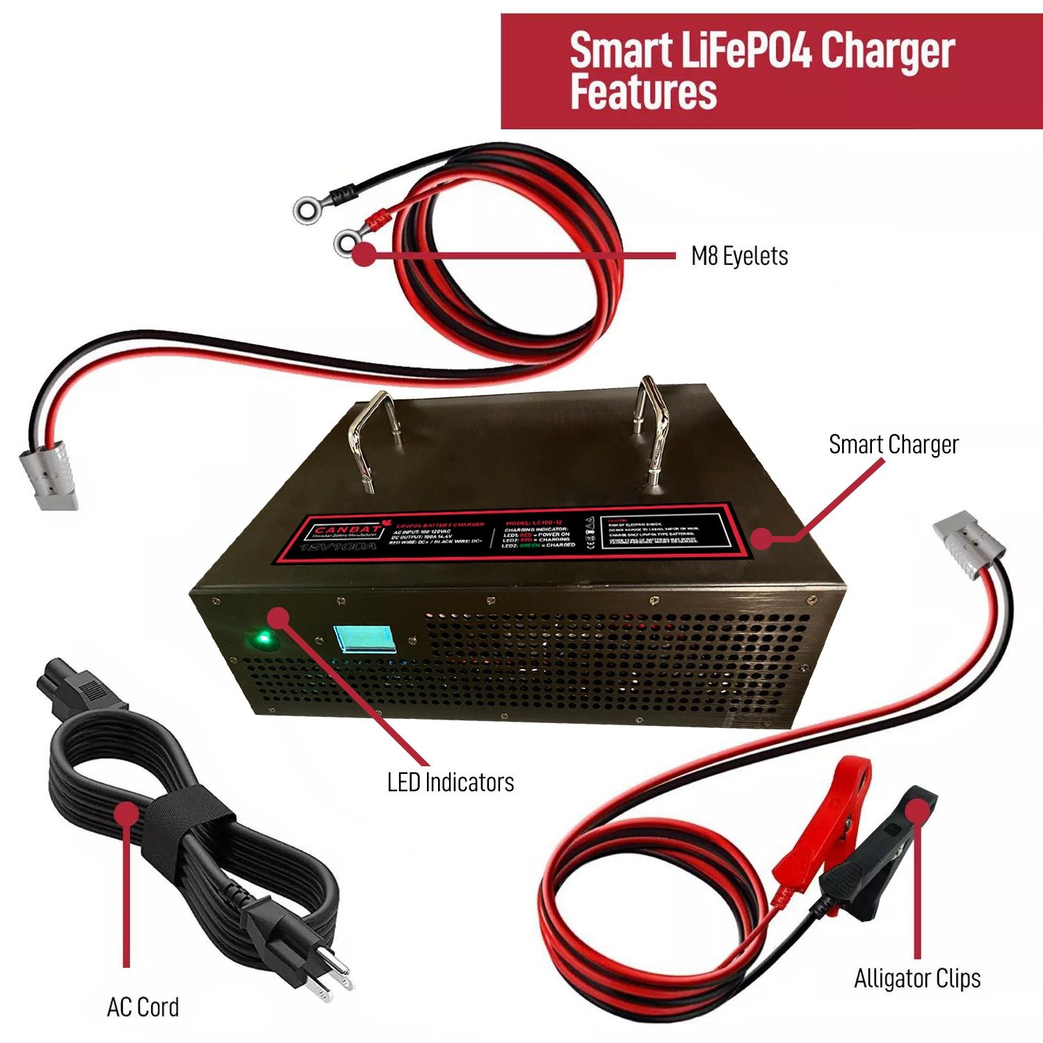 No need to purchase additional charger leads or accessories. The Canbat 100A 12V lithium charger comes with everything you need to charge any size LiFePO4 battery. Easily swap charger leads using the included Anderson Connectors. Here’s the full list of what’s in the box: