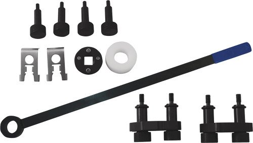 - Includes crank counter hold tool, crankshaft thrust piece, (4) drift for camshaft slide pieces, (2) locking clips, (2) camshaft clips, (1) assembly tool.