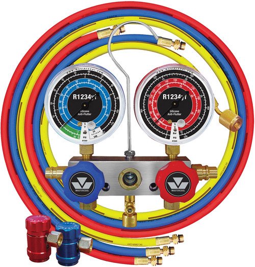 - 83272: R1234yf 2-Way Piston Valve Manifold Gauge Set includes 3-72″ hoses and R1234yf couplers packaged in a clamshell