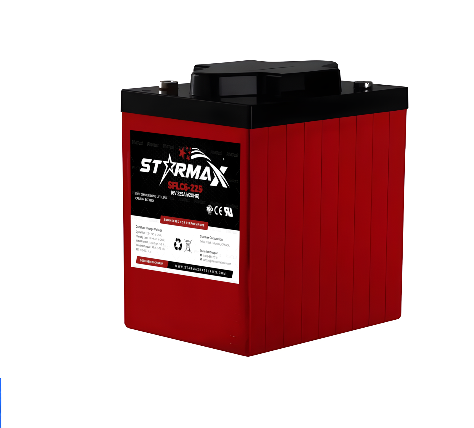 The Starmax SFLC Fast-Charge Long-Life Lead Carbon Battery is a high-performance deep cycle lead carbon battery ideal for solar power systems, off-grid energy storage, wind power applications, sweepers, golf carts, and light industrial electric vehicles. Built for extreme temperatures (-20°C to 60°C), it features low self-discharge, over 3,000 cycles at 50% DOD, and a float service life of ≥20 years. ISO 9001/14001/18001 and CE/IEC certified, this lead carbon battery delivers reliable, long-lasting power for industrial and renewable energy applications.